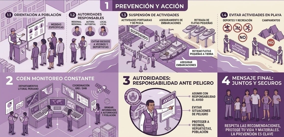 Ante esta situación, el Instituto Nacional de Defensa Civil exhortó a las autoridades regionales y locales a difundir recomendaciones entre la población. Estas sugerencias tienen como finalidad reducir la exposición a posibles incidentes que puedan afectar tanto a personas como a bienes.
