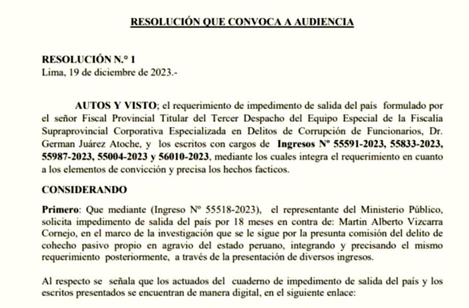“El representante del Ministerio Público —señala el pedido de Juárez enviado al Poder Judicial—, solicita impedimento de salida del país por 18 meses en contra de Martín Alberto Vizcarra Cornejo, en el marco de la investigación que se le sigue por la presunta comisión del delito de cohecho pasivo propio en agravio del Estado peruano, integrando y precisando el mismo requerimiento posteriormente, a través de la presentación de diversos ingresos”, señala la resolución.
