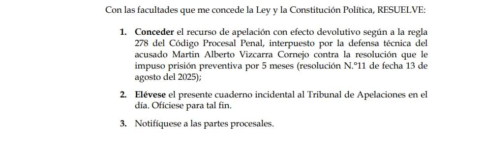 El magistrado precisó que la apelación tiene efecto devolutivo, lo que significa que Vizcarra continuará bajo prisión preventiva mientras se resuelve la impugnación.