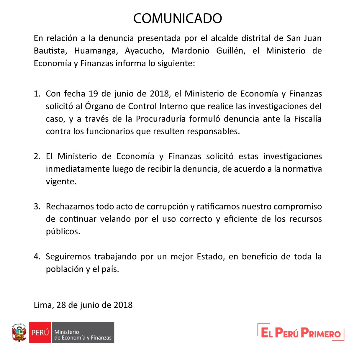 Luego de que el presidente de la República, Martín Vizcarra, convocara ayer a una conferencia de prensa para informar sobre una denuncia de corrupción realizada por el alcalde del distrito ayacuchano de San Juan Bautista, Mardonio Guillén, contra altos funcionarios públicos del Ministerio de Economía y Finanzas, el MEF emitió un comunicado oficial informando a la ciudadanía que la investigación correspondiente se encuentra en curso.