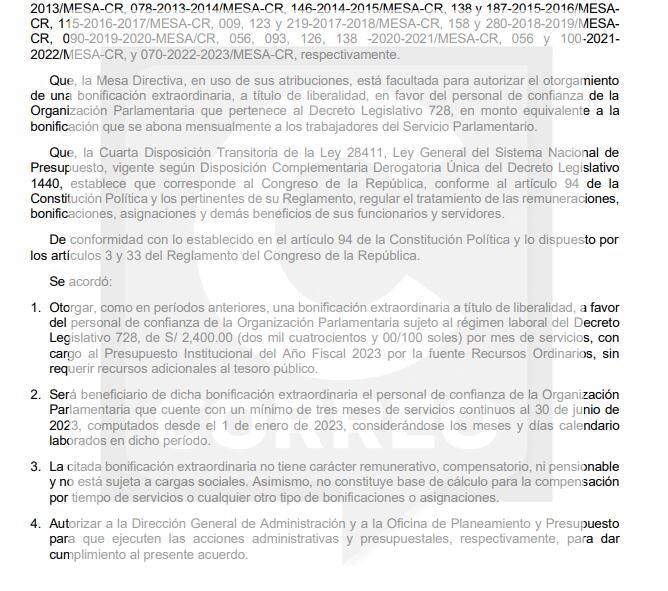 “Otorgar, como en períodos anteriores, una bonificación extraordinaria a título de liberalidad, a favor del personal de confianza de la Organización Parlamentaria sujeto al régimen laboral del Decreto Legislativo 728, de S/ 2,400.00 (dos mil cuatrocientos y 00/100 soles) por mes de servicios, con cargo al Presupuesto Institucional del Año Fiscal 2023 por la fuente Recursos Ordinarios, sin requerir recursos adicionales al tesoro público”, se indica en el documento al que accedió Correo.