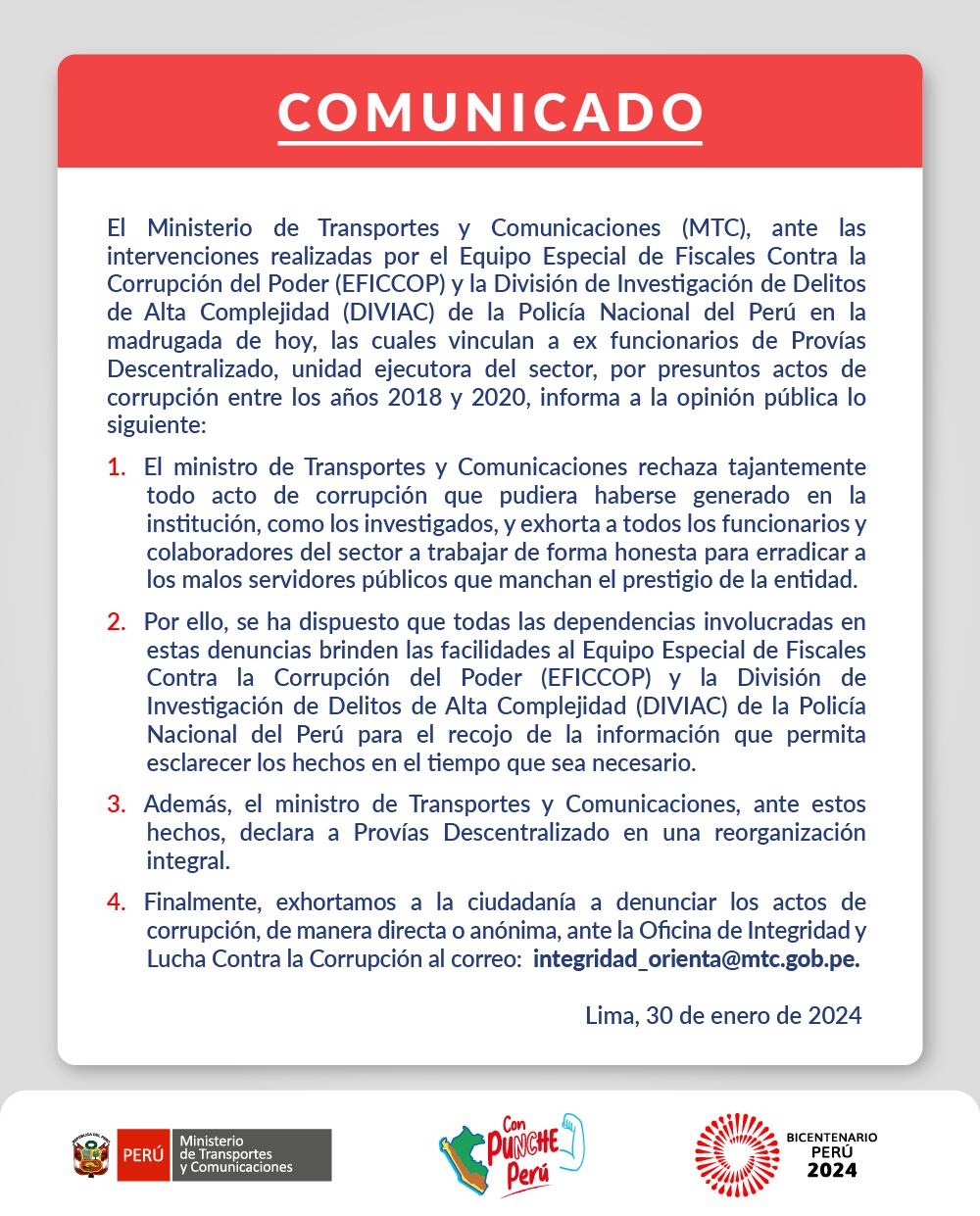 En un comunicado, el MTC señaló que el titular del sector, Raúl Pérez reyes, “declara a Provías Descentralizado en una reorganización integral”.