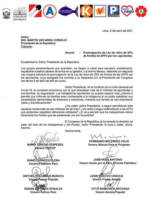 Un total de ocho bancadas parlamentarias volvieron a solicitar al presidente Martín Vizcarra la promulgación de la Ley que permite el retiro del 25% de las Administradoras de Fondos de Pensiones (AFP), a una semana del plazo legal para su aprobación u observación.