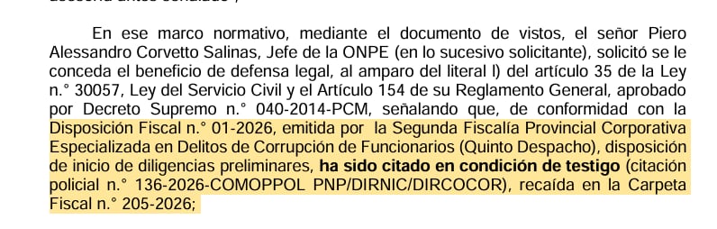“El beneficio de defensa legal comprende la etapa preliminar y hasta su culminación en la etapa preparatoria, conforme a lo solicitado por el señor Piero Alessandro Corvetto Salinas, Jefe de la ONPE, en su propuesta de defensa legal”, indica el documento.