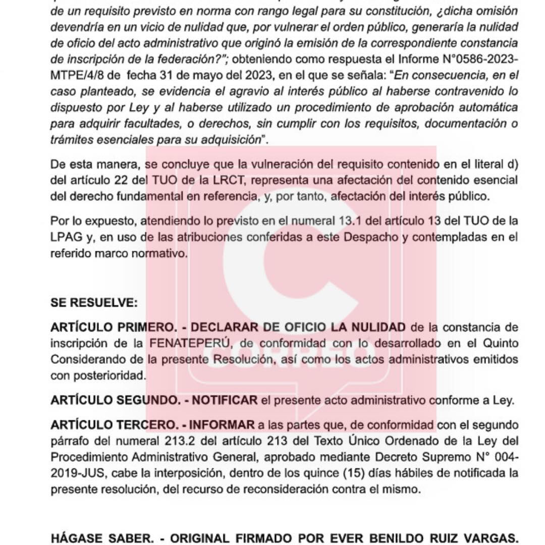 “Declarar de oficio la nulidad de la constancia de inscripción de la Fenate Perú, de conformidad con lo desarrollado en el quinto considerando de la presidente resolución, así como los actos administrativos emitidos con posteridad”, se indica en un documento al que accedió Correo.