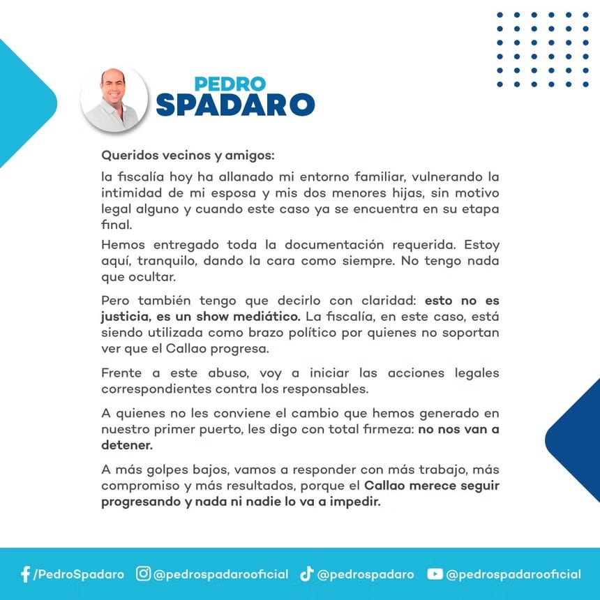 El exalcalde del Callao, Pedro Spadaro, se pronunció luego del allanamiento a su vivienda realizado durante un megaoperativo en el marco de una investigación por presuntos actos de corrupción vinculados a procesos de contratación pública en la Municipalidad Provincial del Callao entre 2023 y 2025.