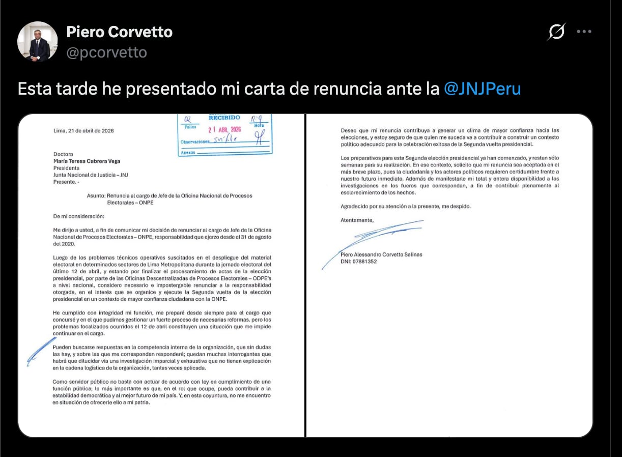 El jefe de la Oficina Nacional de Procesos Electorales (ONPE), Piero Corvetto, presentó su renuncia al cargo, según una carta dirigida a la presidenta de la Junta Nacional de Justicia, María Teresa Cabrera Vega, con fecha 21 de abril de 2026.