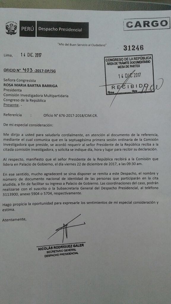 A través de un oficio del Despacho Presidencial, se comunicó este jueves que el presidente de la República Pedro Pablo Kuczynski ofreció a los miembros de la Comisión Lava Jato reunirse el próximo 22 de noviembre en Palacio de Gobierno para esclarecer su situación respecto a las vinculaciones del mandatario con la constructora Odebrecht. La reunión será a las 09:30 horas