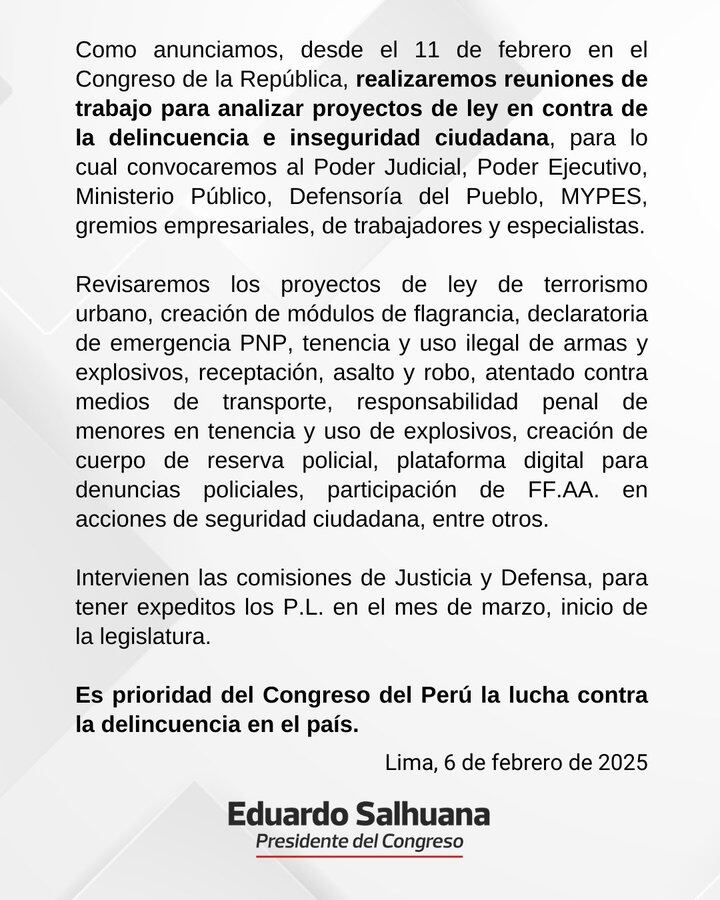 El presidente del Congreso, Eduardo Salhuana, publicó un comunicado en su cuenta oficial de X, donde asegura que desde el 11 de febrero se iniciarán las reuniones de trabajo para analizar los proyectos de ley contra la inseguridad ciudadana.