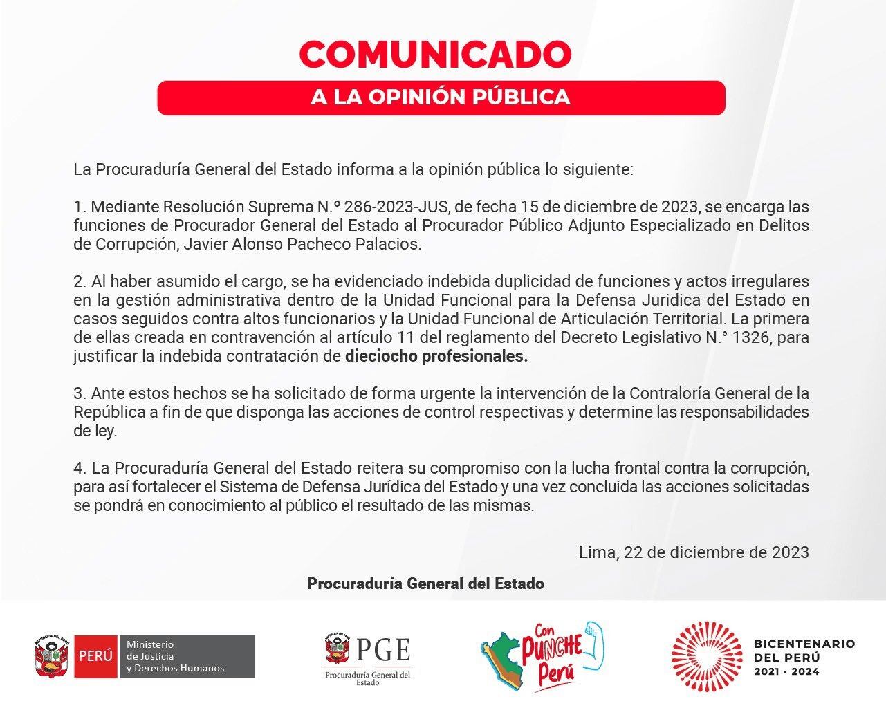 “Se ha evidenciado indebida duplicidad de funciones y actos irregulares en la gestión administrativa dentro de la Unidad Funcional para la Defensa Jurídica del Estado en casos seguidos contra altos funcionarios y la Unidad Funcional de Articulación Territorial”, se lee en el comunicado.