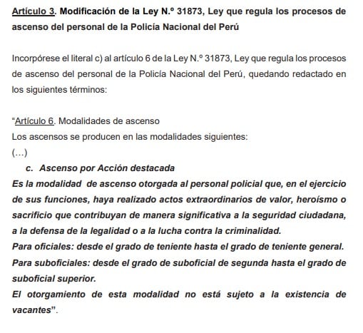 El texto señala que esta modificación permitiría el ascenso por acción destacada tanto para oficiales como para suboficiales de la institución. En esa línea, establece que el beneficio no dependerá de la existencia de vacantes disponibles dentro del cuadro de ascensos.