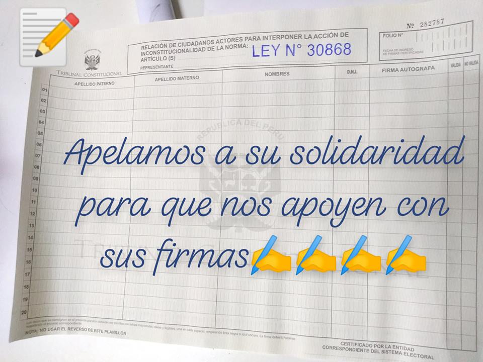 A través de un comunicado, Waynakuna Perú indicó que las firmas vienen siendo recogidas en distintos lugares de Lima a través de activistas y las bases del Movadef. "Es una campaña subrepticia e invisible que se realiza, desde Comas, Villa El Salvador, Villa María del triunfo, hasta incluso en la plaza San Martín. Están buscando juntar la mayor cantidad de firmas necesarias para presentarlas ante el JNE", se lee.