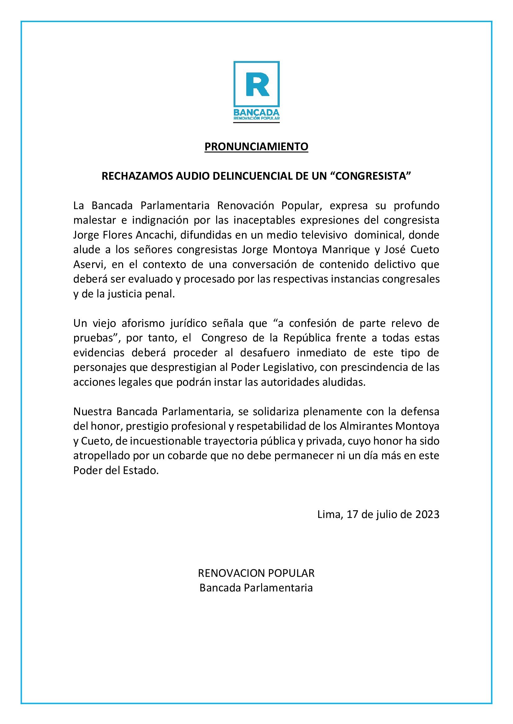 “La Bancada parlamentaria Renovación Popular expresa su profundo malestar e indignación por las inaceptables expresiones del congresista Jorge Flores Ancachi, difundidas en un medio televisivo dominical, donde alude a los señores congresistas Jorge Montoya Manrique y José Cueto Aservi, en el contexto de una conversación de contenido delictivo que deberá ser evaluado y procesado por las respectivas instancias congresales y de la justicia penal”, precisa el comunicado.
