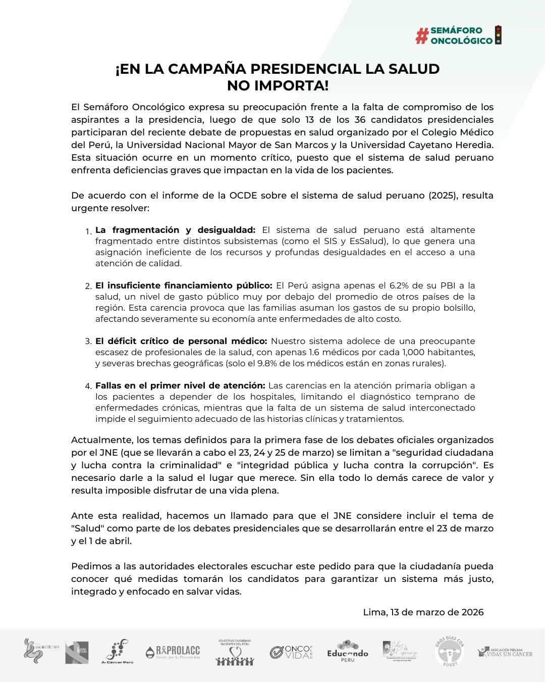 El colectivo Semáforo Oncológico., que agrupa a organizaciones de pacientes y sociedad civil, organizó un foro sobre salud ante la falta de candidatos presidenciales en el debate liderado por el Colegio Médico del Perú, la Universidad Mayor de San Marcos y la Universidad Cayetano Heredia. El documento señala que solo 13 de 36 postulantes asistieron al evento, evidenciando su poco interés por la agenda sanitaria.