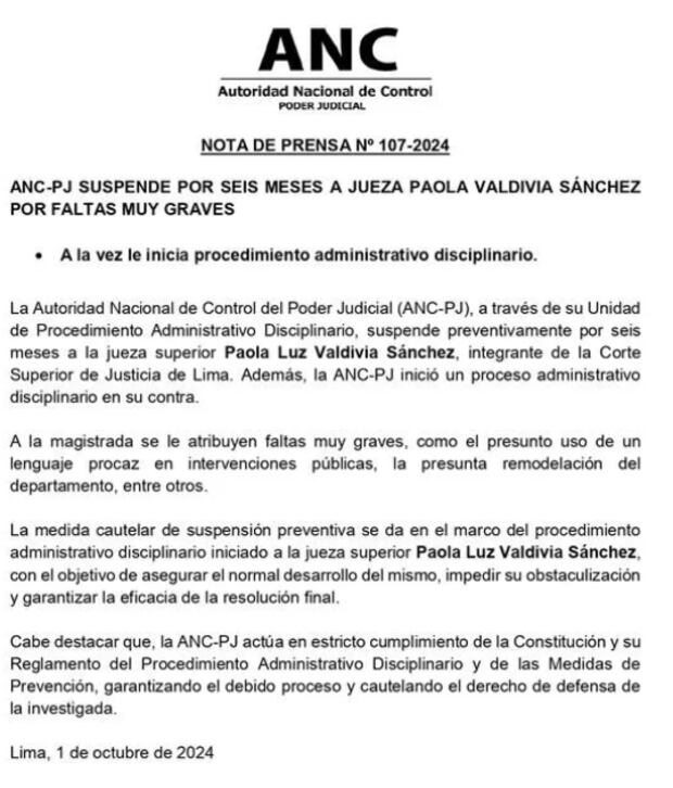“La medida cautelar de suspensión preventiva se da en el marco del procedimiento administrativo disciplinario iniciado a la jueza superior Paola Luz Valdivia Sánchez, con el objetivo de asegurar el normal desarrollo del mismo, impedir su obstaculización y garantizar la eficacia de la resolución final”, se lee en el comunicado.