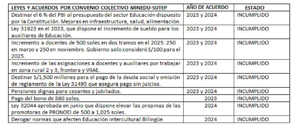 Por su parte el Ministerio de Educación (Minedu) declaró improcedente la huelga convocada. Según la Resolución de Secretaría General N.° 191-2024-Minedu, la medida carece de sustento legal, pues el Sutep no presentó la documentación requerida que acredite la aprobación de la huelga por sus bases y refrendada por notario o juez de paz.