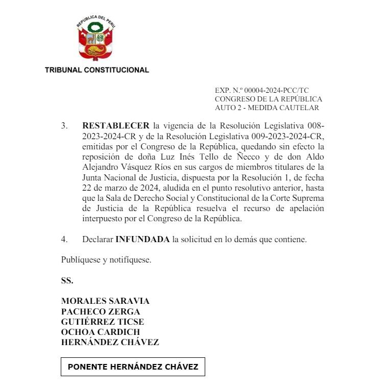 “Restablecer la vigencia de la Resolución Legislativa 008-2023-2024-CR y de la Resolución Legislativa 009-2023-2024-CR, emitidas por el Congreso de la República, quedado sin efecto la reposición de doña Luz Inés Tello de Ñecco y de don Aldo Alejandro Vásquez Ríos, en sus cargos de miembros titulares de la Junta Nacional de Justicia”, se lee en el oficio.