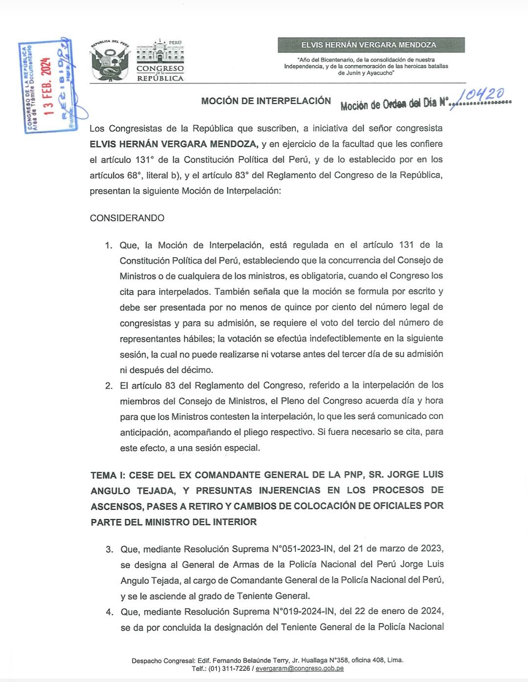 El congresista Elvis Hernán Vergara Mendoza presentó una segunda moción de interpelación contra el ministro del Interior, Víctor Torres. El titular del Mininter deberá responder por tres temas: el retiro de Jorge Angulo, las acciones ejecutadas ante la ola de inseguridad ciudadana y el control fronterizo.