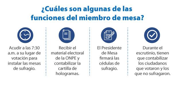 Según la Ley Orgánica de Elecciones (Ley N° 26859) el cargo de miembro de mesa es irrenunciable. Los ciudadanos que no cumplan con su deber tendrán que pagar S/215 soles de multa. También se sancionará a las personas que se nieguen a integrar una mesa de sufragio ante la ausencia de alguno de sus miembros.