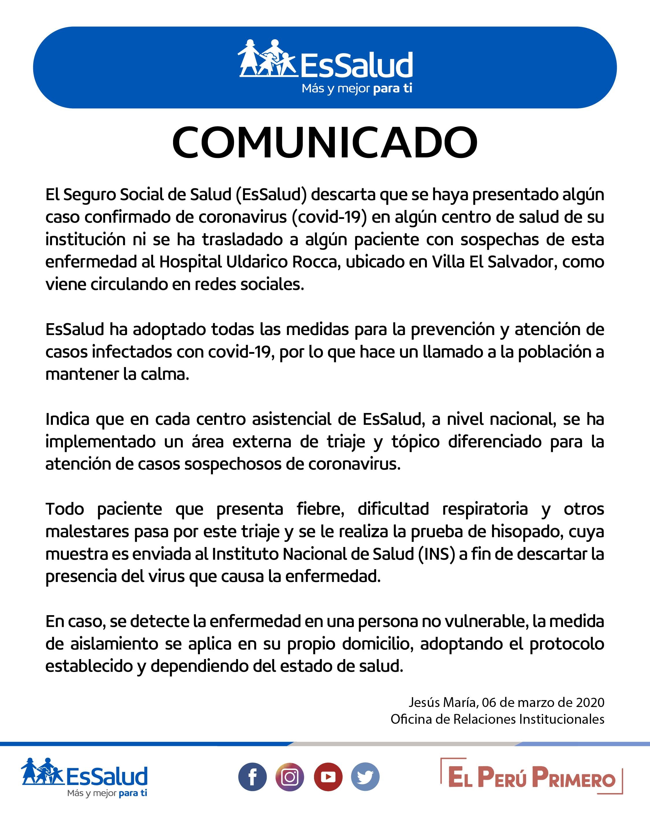“EsSalud ha adoptado todas las medidas para la prevención y atención a los casos infectados con Covid-19, por lo que hace un llamado a la población a mantener la calma”, se puede leer en el comunicado expedido a través de sus redes sociales.