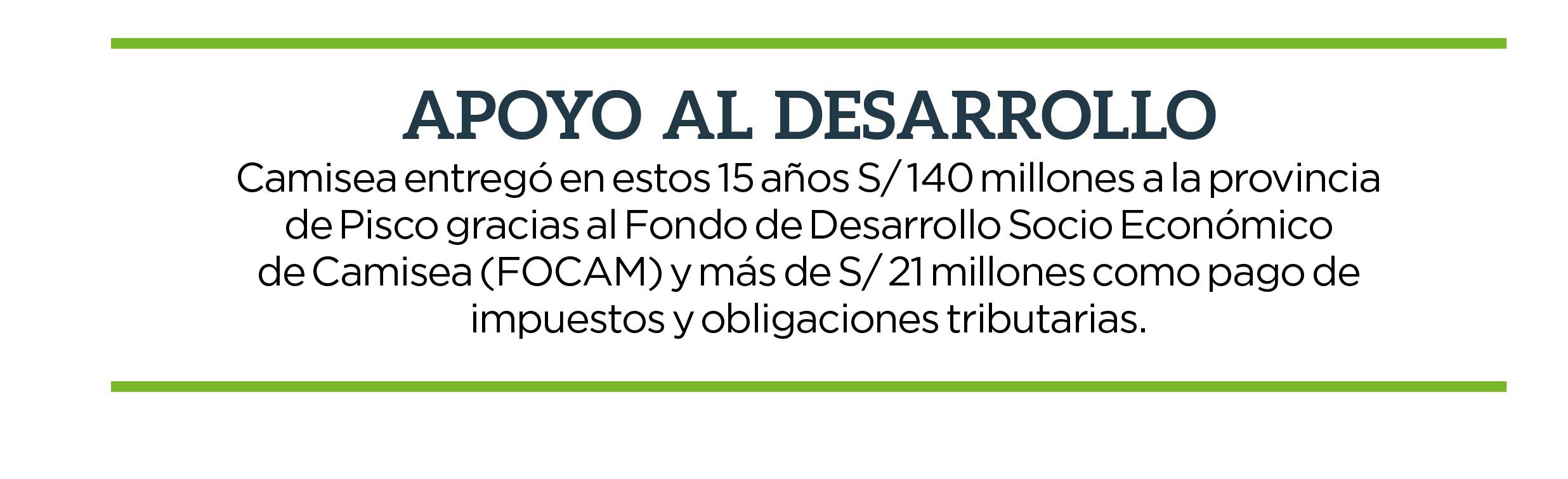 Es preciso mencionar también el Compromiso Marco, que significa S/ 100 millones para Pisco y repercute en obras para la provincia y sus ocho distritos: San Andrés, San Clemente, Independencia, Humay, Huáncano, Paracas, Túpac Amaru y Pisco. De esta cantidad, S/ 35 millones se destinaron a la ejecución de 36 proyectos presentados por los gobiernos locales y S/ 65 millones hicieron posibles obras de educación, salud, pesca, turismo y cultura. De esta manera, Camisea se convierte en una de las empresas que mayor aporte social ha entregado a la provincia pisqueña.