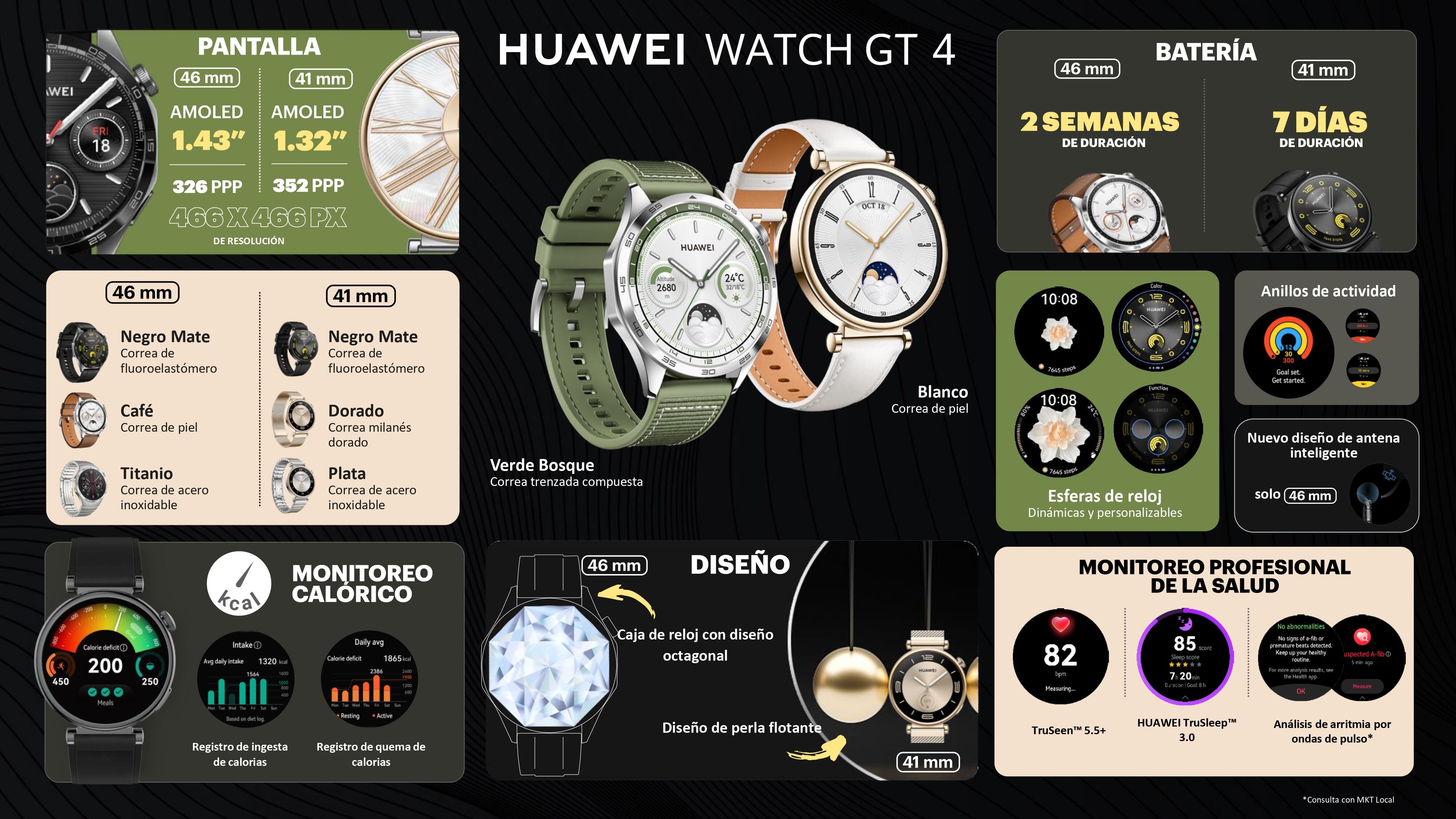 Huawei Consumer Business Group (CBG) anunció el lanzamiento de HUAWEI WATCH GT 4, la última generación de la icónica serie WATCH GT, que introduce características de diseño de alta gama con potentes funcionalidades para las actividades físicas y el bienestar de la salud. Este modelo se presenta como el último hito en una historia de años de innovación en el rubro de los smartwatches. El dispositivo, también forma parte de la nueva propuesta “Fashion Forward” de Huawei para su tecnología de wearables, que lleva la integración de la tecnología y la moda al siguiente nivel, permitiendo a los usuarios personalizar sus sesiones deportivas y de salud, sin renunciar al estilo, eligiendo entre un llamativo diseño de bisel octogonal o el elegante diseño colgante.